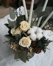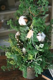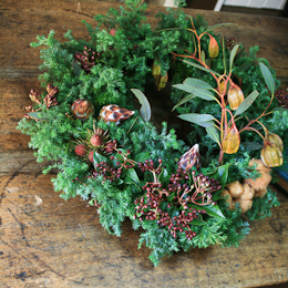 12月はフレッシュグリーンや実ものを使ったクリスマスリースです。参考写真です。サイズφ34cmくらい、金額は¥4000−、所要時間は2時間です。ご希望の方はメールもしくはお電話でお願いします。