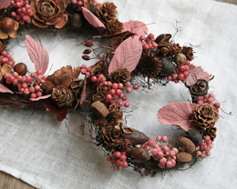 写真のピンク系+茶、ペッパーベリーのリースです。