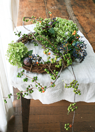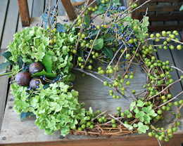 花材は少し秋らしさを出したかったので「ツルウメモドキ」を使ってみました。ツルの良さをそのまま出したかったので、あまり切らずにそのまま30cmのリース台に付けました。かなり大きく迫力あるリースが出来上がりました!