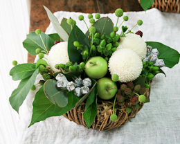 器もリンゴのような雰囲気の、コロンとした形です。花材も丸いものを多く、どこから見てもよいアレンジです。