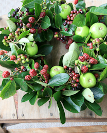 この日はチョコベリーが少しで、ビバーナムティナスや野バラの実など、たくさんの実ものいっぱいのリースです。