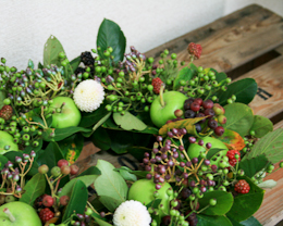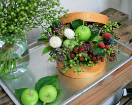 ビバーナムティナスや野バラの実やブラックベリーなど、同じ花材でもデザインにより、いろいろな雰囲気に出来上がります。ウッドボックスにフルーツの詰め合わせのようです。