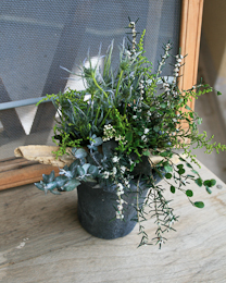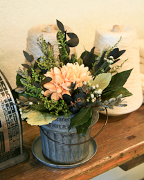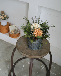 写真は紫っぽいエリンジュームや流木で、夏らしいアレンジです。プリザーブドのワイヤープランツがいい感じで、お気に入りのオススメです。